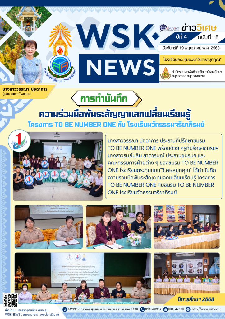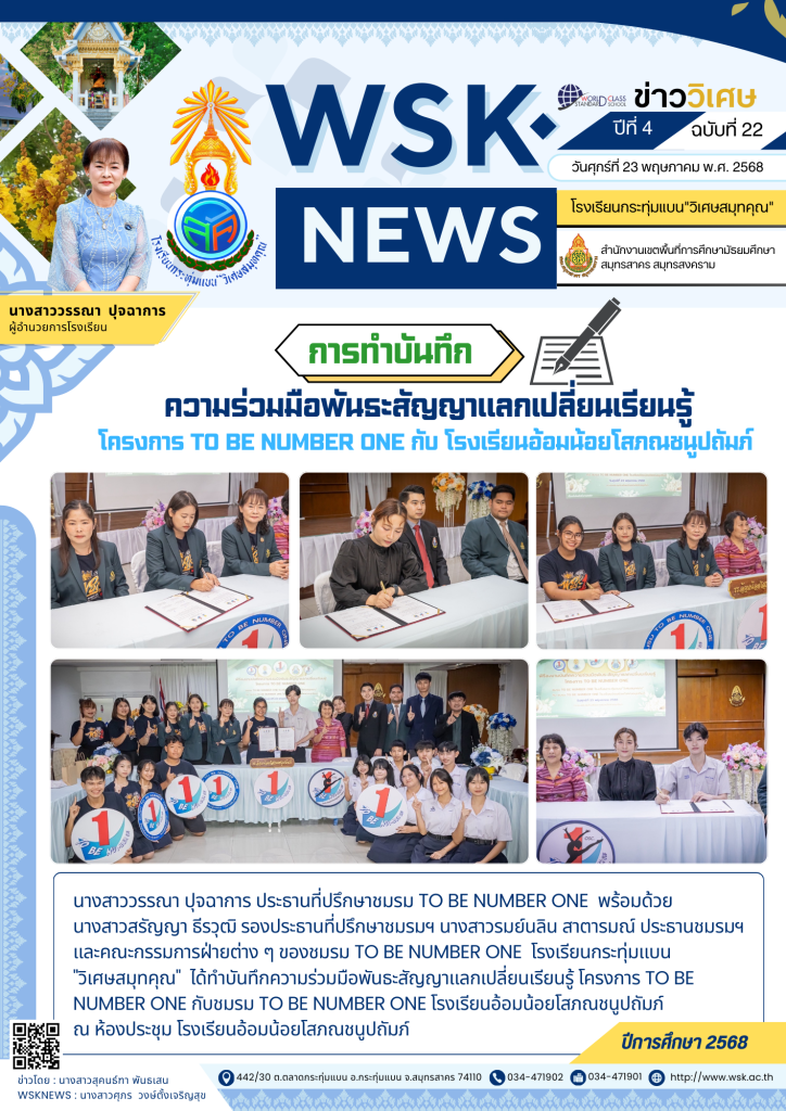 วันศุกร์ที่ 23 พฤษภาคม พ.ศ. 2568 นางสาววรรณา ปุจฉาการ ประธานที่ปรึกษาชมรม TO BE NUMBER ONE พร้อมด้วย นางสาวสรัญญา ธีรวุฒิ รองประธานที่ปรึกษาชมรมฯ นางสาวรมย์นลิน สาตารมณ์ ประธานชมรมฯ และคณะกรรมการฝ่ายต่าง ๆ ของชมรม TO BE NUMBER ONE โรงเรียนกระทุ่มแบน”วิเศษสมุทคุณ” ได้ทำบันทึกความร่วมมือพันธะสัญญาแลกเปลี่ยนเรียนรู้ โครงการ TO BE NUMBER ONE กับชมรม TO BE NUMBER ONE โรงเรียนอ้อมน้อยโสภณชนูปถัมภ์ ณ ห้องประชุม โรงเรียนอ้อมน้อยโสภณชนูปถัมภ์ ข่าวโดย : นางสาวสุคนธ์ฑา พันธเสนWSKNEWS : นางสาวศุภร วงษ์ตั้งเจริญสุข