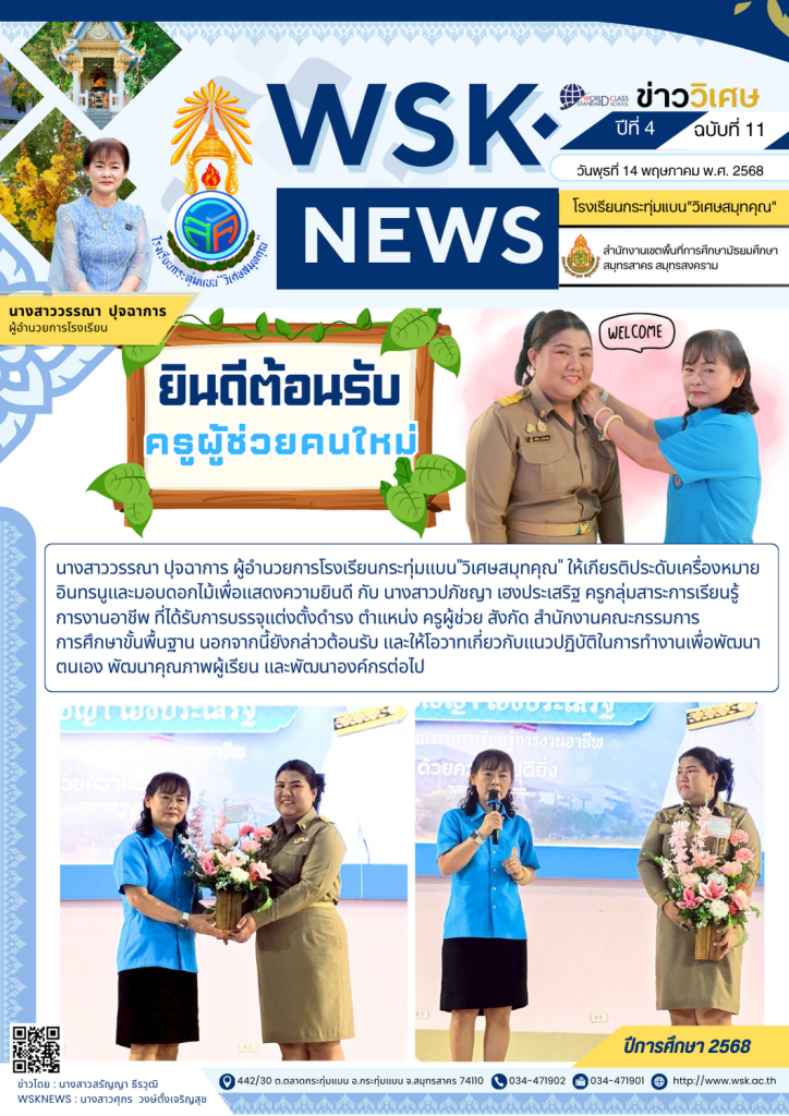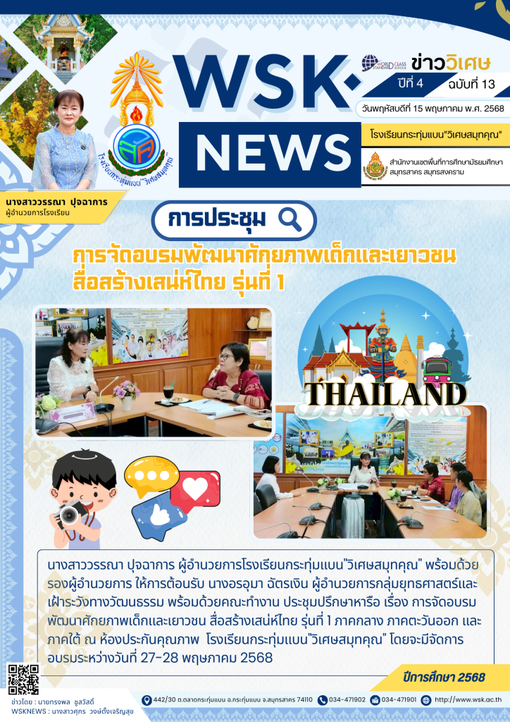 วันพฤหัสบดีที่ 15 พฤษภาคม พ.ศ. 2568 นางสาววรรณา ปุจฉาการ ผู้อำนวยการโรงเรียนกระทุ่มแบน”วิเศษสมุทคุณ” พร้อมด้วยรองผู้อำนวยการ ให้การต้อนรับ นางอรอุมา ฉัตรเงิน ผู้อำนวยการกลุ่มยุทธศาสตร์และเฝ้าระวังทางวัฒนธรรม พร้อมด้วยคณะทำงาน ประชุมปรึกษาหารือ เรื่อง การจัดอบรมพัฒนาศักยภาพเด็กและเยาวชน สื่อสร้างเสน่ห์ไทย รุ่นที่ 1 ภาคกลาง ภาคตะวันออก และภาคใต้ ณ ห้องประกันคุณภาพ โรงเรียนกระทุ่มแบน”วิเศษสมุทคุณ” โดยจะมีจัดการอบรมระหว่างวันที่ 27-28 พฤษภาคม 2568 ข่าวโดย : นายทรงพล ชูสวัสดิ์WSKNEWS : นางสาวศุภร วงษ์ตั้งเจริญสุข