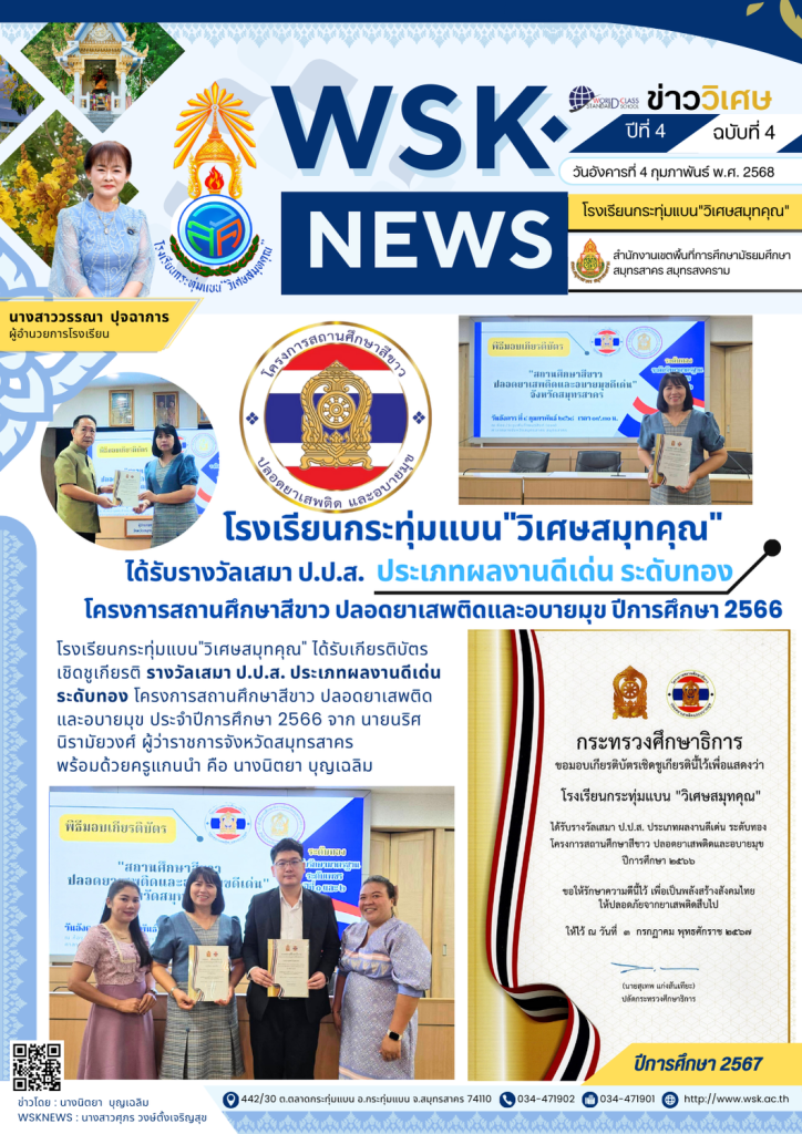 วันพุธที่ 5 กุมภาพันธ์ พ.ศ. 2568 นางสาววรรณา ปุจฉาการ ผู้อำนวยการโรงเรียนกระทุ่มแบน”วิเศษสมุทคุณ” ได้มอบหมายให้ นางสาวสรัญญา ธีรวุฒิ รองผู้อำนวยการกลุ่มบริหารงานบุคคล มอบเกียรติบัตรให้กับนักเรียนที่เข้าร่วมการแข่งขันงานศิลปหัตถกรรมนักเรียน ครั้งที่ 72 ปีการศึกษา 2567 โดยมีรายการแข่งขันดังนี้ ข่าวโดย : นางสาวชญาพัชชา แก่นนาคำWSKNEWS : นางสาวศุภร วงษ์ตั้งเจริญสุข
