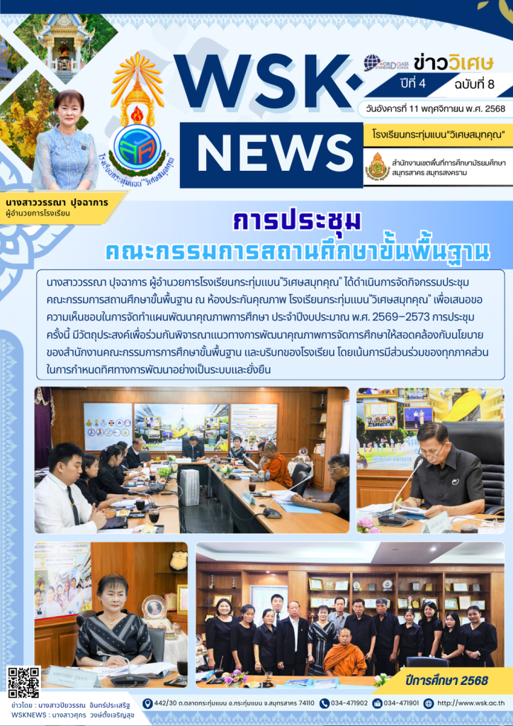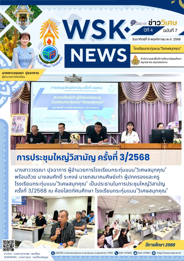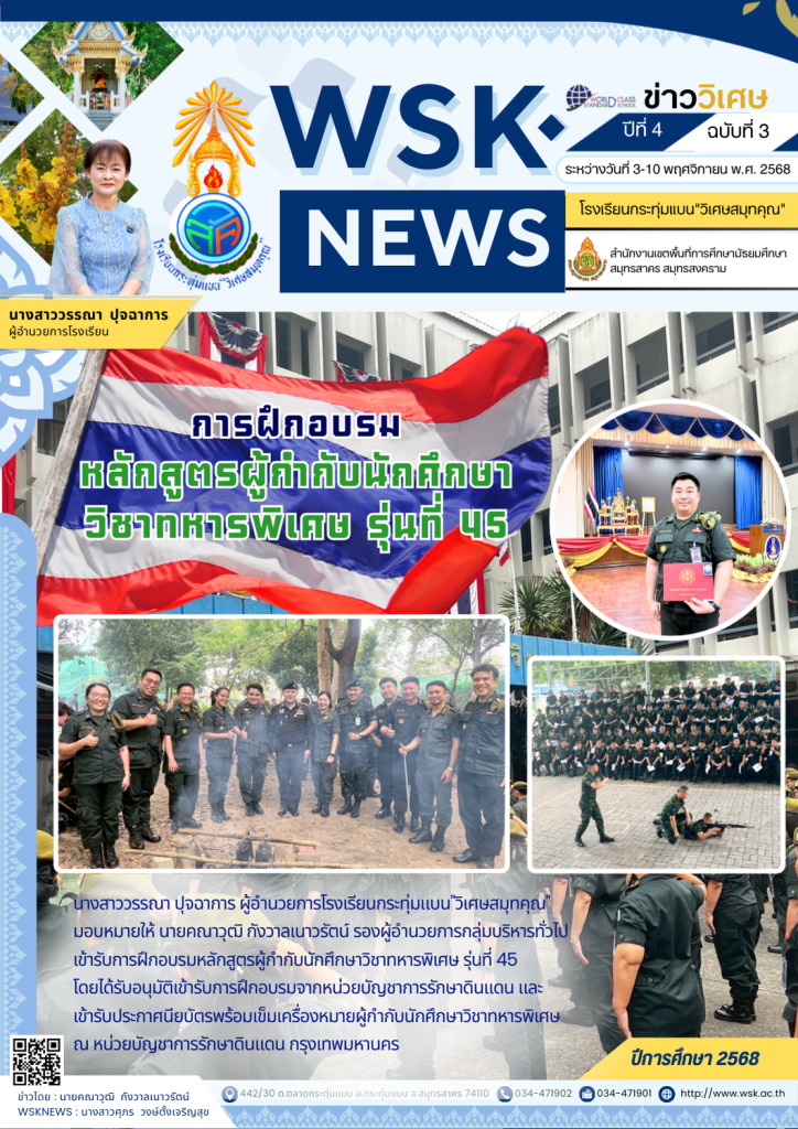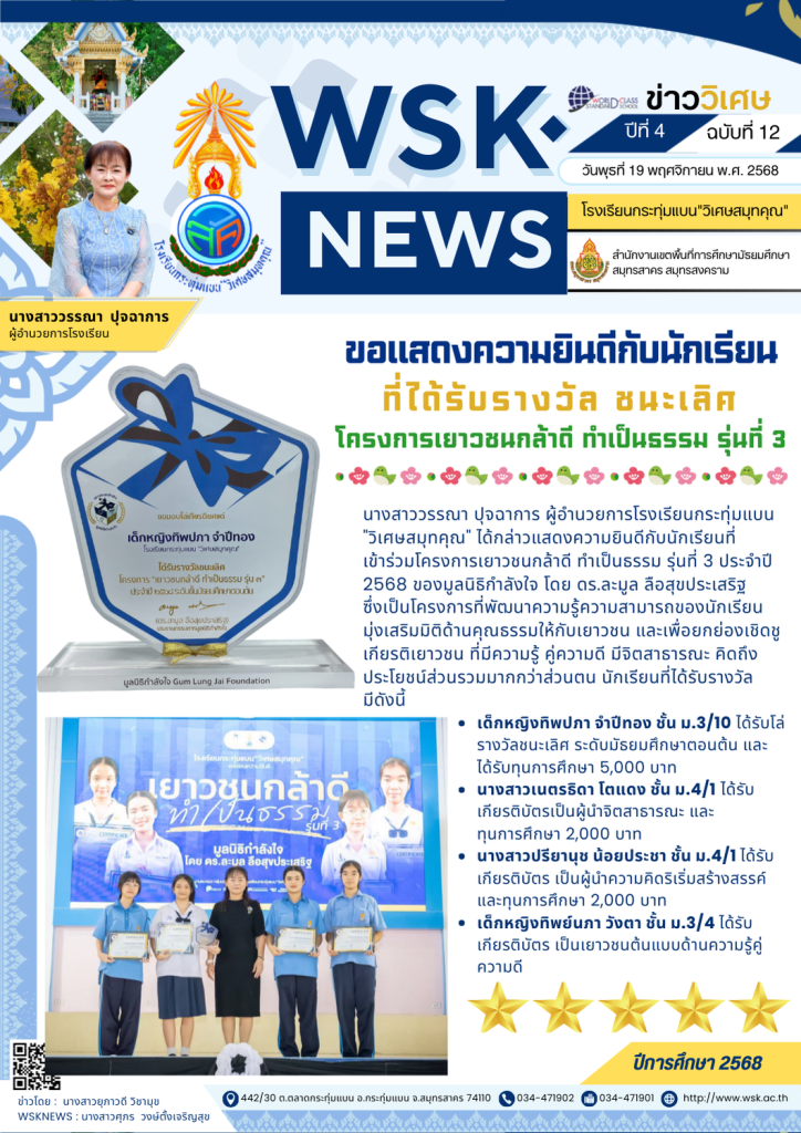 วันพุธที่ 19 พฤศจิกายน พ.ศ. 2568 นางสาววรรณา ปุจฉาการ ผู้อำนวยการโรงเรียนกระทุ่มแบน “วิเศษสมุทคุณ” ได้กล่าวแสดงความยินดีกับนักเรียนที่ เข้าร่วมโครงการเยาวชนกล้าดี ทำเป็นธรรม รุ่นที่ 3 ประจำปี 2568 ของมูลนิธิกำลังใจ โดย ดร.ละมูล ลือสุขประเสริฐ ซึ่งเป็นโครงการที่พัฒนาความรู้ความสามารถของนักเรียน มุ่งเสริมมิติด้านคุณธรรมให้กับเยาวชน และเพื่อยกย่องเชิดชูเกียรติเยาวชน ที่มีความรู้ คู่ความดี มีจิตสาธารณะ คิดถึงประโยชน์ส่วนรวมมากกว่าส่วนตน นักเรียนที่ได้รับรางวัล มีดังนี้ ข่าวโดย : นางสาวยุภาวดี วิชามุขWSKNEWS : นางสาวศุภร วงษ์ตั้งเจริญสุข