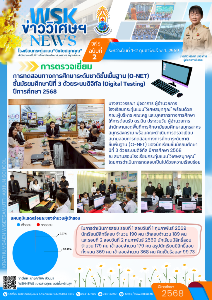 นางสาววรรณา ปุจฉาการ ผู้อำนวยการ โรงเรียนกระทุ่มแบน”วิเศษสมุทคุณ” พร้อมด้วย คณะผู้บริหาร คณะครู และบุคลากรทางการศึกษา ให้การต้อนรับ ดร.มิน ประจวบวัน ผู้อำนวยการสำนักงานเขตพื้นที่การศึกษามัธยมศึกษาสมุทรสาคร สมุทรสงคราม พร้อมคณะดำเนินการตรวจเยี่ยมสนามสอบการทดสอบทางการศึกษาระดับชาติ ขั้นพื้นฐาน (O-NET) ของนักเรียนชั้นมัธยมศึกษา ปีที่ 3 ด้วยระบบดิจิทัล ปีการศึกษา 2568 ณ สนามสอบโรงเรียนกระทุ่มแบน”วิเศษสมุทคุณ” โดยการดำเนินการทดสอบเป็นไปด้วยความเรียบร้อย