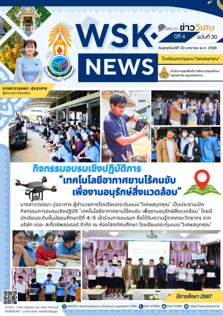 นางสาววรรณา ปุจฉาการ ผู้อำนวยการโรงเรียนกระทุ่มแบน”วิเศษสมุทคุณ” เป็นประธานเปิดกิจกรรมการอบรมเชิงปฏิบัติ “เทคโนโลยีอากาศยานไร้คนขับ เพื่องานอนุรักษ์สิ่งแวดล้อม” โดยมีนักเรียนระดับชั้นมัธยมศึกษาปีที่ 4-6 เข้าร่วมการอบรมฯ ซึ่งได้รับความรู้จากคณะวิทยากร จาก บริษัท เดอะ สเก็ตซ์พลอเรอร์ จำกัด ณ ห้องโสตทัศนศึกษา โรงเรียนกระทุ่มแบน”วิเศษสมุทคุณ”